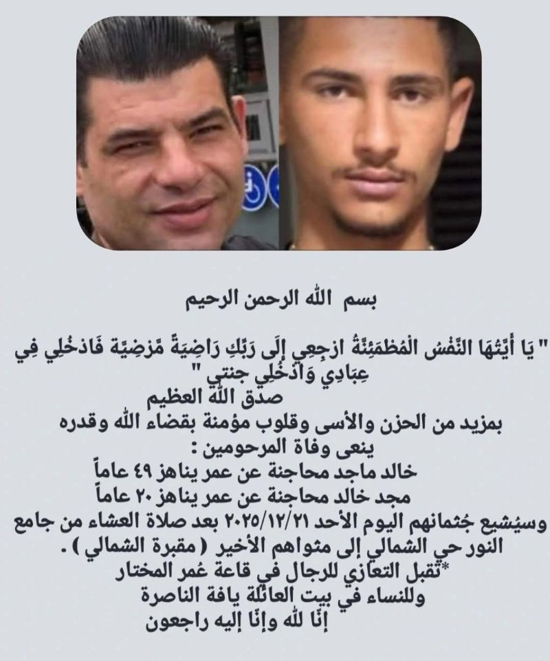 يافة الناصرة / ام الفحم: علم مراسلنا أن جنازة ضحيتي جريمة القتل النكراء مساء أمس في حي الكروم بالناصرة، المرحومين خالد ماجد بدير محاجنة ونجله مجد خالد محاجنة، وهما في الأصل أبناء عائلة بدير في مدينة ام الفحم، ستكون اليوم الأحد، بعد صلاة العشاء من مسجد النور في يافة الناصرة الى مثواهما في المقبرة الشمالية في الحي الشمالي.