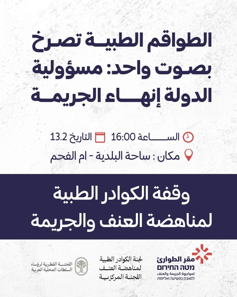 الطواقم الطبية العربية تستعد لإطلاق صرختها ضد العنف والجريمة في مظاهرة احتجاجية بمدينة ام الفحم بعد غد الجمعة