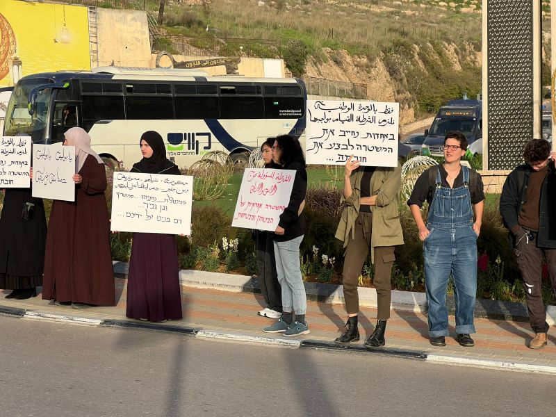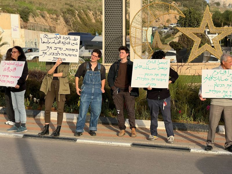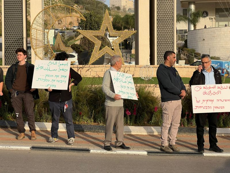 ورفع المحتجون بالوقفة التي نُظّمت عند الدوار الأول في المدينة، لافتات تتهم الشرطة الإسرائيلية بالتواطؤ مع الجريمة المنظّمة في البلدات العربية، وكُتب على بعض اللافتات شعارات من قبيل: “يا بوليس ويا بوليس الدم العربي مش رخيص”، و”اجمعوا السلاح وجفّفوا السلاح”، و”الشرطة المسؤولة عن الأمن والأمان”.