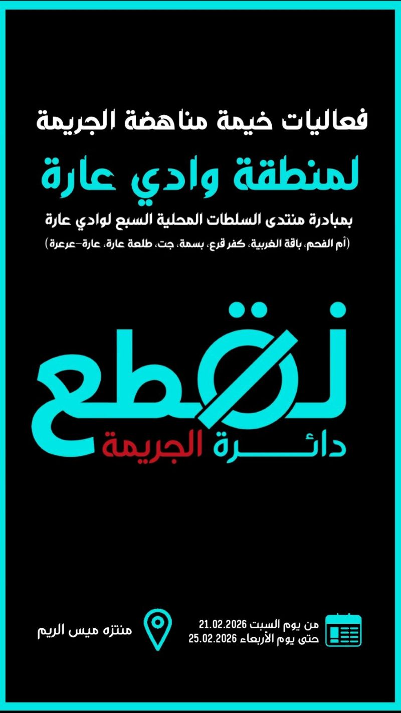 تنطلق، اعتبارًا من مساء اليوم السبت، فعاليات خيمة مناهضة العنف لمنطقة وادي عارة في منتزه ميس الريم، عملًا بقرار سابق اتخذه منتدى السلطات المحلية السبع في المنطقة (ام الفحم، باقة الغربية، كفر قرع، بسمة، جت، طلعة عارة، عارة – عرعرة)، ونزولًا عند توجيهات المقر القطري لمناهضة العنف المنبثق عن اللجنة القطرية ولجنة المتابعة.