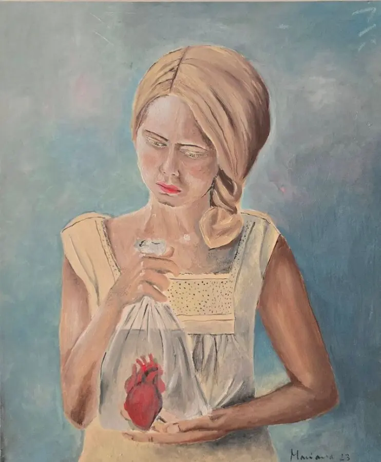 القلب يرمز للمشاعر الإنسانية التي تتعرض للضغط والتقييد وكأنها محاصرة داخل هذا الإطار الضيق… والفتاة العابسة تحمل كيسَا صغيرًا مغلقًا وداخله قلب محاط بالماء…