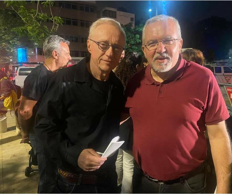 ** غروسمان برفقة الكاتب عودة بشارات (ابن الناصرة) خلال احدى المظاهرات في تل ابيب الداعية لوقف الحرب