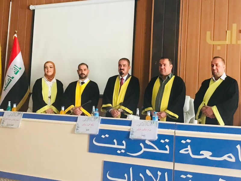 نُوقشت الرّسالة في داخل أروقة كليّة التّربية للعلوم الإنسانيّة، وتكوّنت لجنة مناقشة الرّسالة من: أ. د. غنّام محمد خضر/ رئيساً، وأ. د. نافع حمّاد محمد/ عضواً، وأ. د. سهيل صالح عيسى/ عضواً، وأ. د. سناء سلمان عبد الجبّار/ عضواً ومشرفاً.
