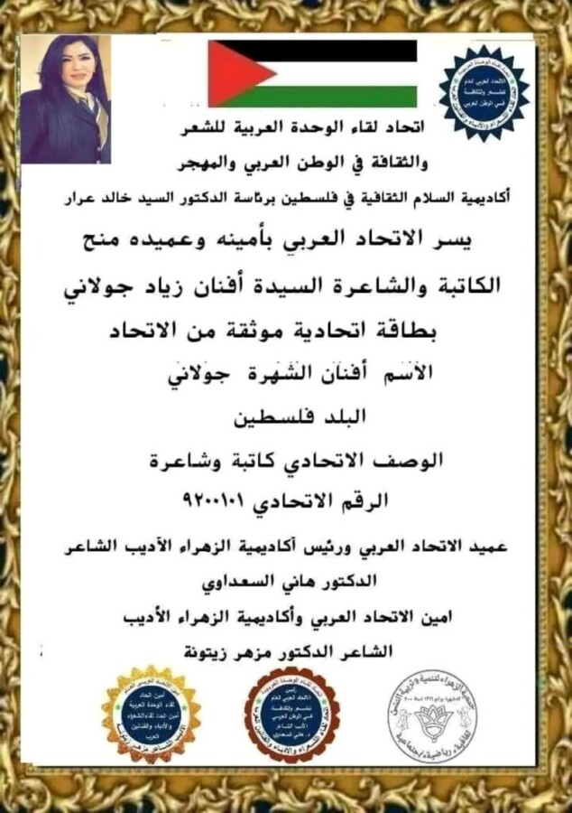 أبلغ الاتحاد العربي العام للشعر والثقافة في جمهورية مصر العربية الشاعرة والاديبة والكاتبة المقدسية افنان جولاني بقراره قبولها عضوًا رسميًا في الاتحاد، ومنحها لقب “زهراء العرب”، واعتماد وتوثيق نص قصيدتها الجميلة “لأحدِهم.. في قلبِي عرشٌ”، والتي سبق ان نشرت في زاوية الادب في موقعنا “المسار” (https://almasar.press/6082/).