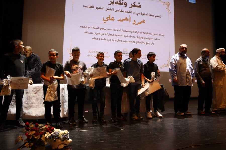 نظّمت هيئة الدعوة في أم الفحم حفلًا تكريميًا للمشاركين والفائزين في مسابقة “مِن يَنابِيعُ السنَّة” لحفظ الحديث النبوي الشريف، وذلك يوم الثلاثاء الثامن من ربيع الثاني 1447ه الموافق 30.09.2025م، في قاعة المركز الجماهيري في أم الفحم.