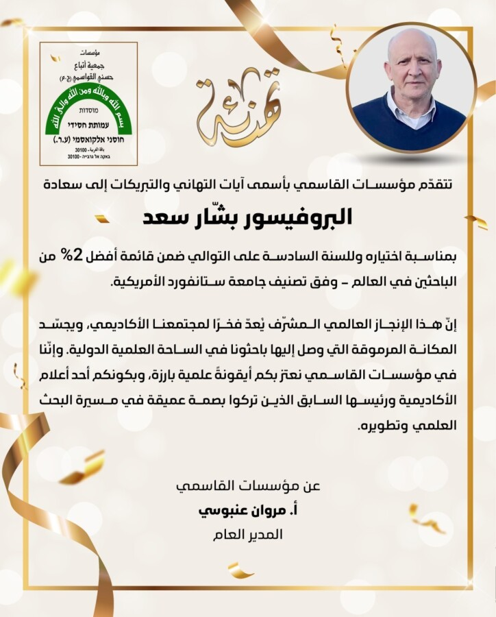 مؤسسات القاسمي تهنئ البروفيسور بشار سعد لاختياره ضمن قائمة أفضل 2% من الباحثين في العالم