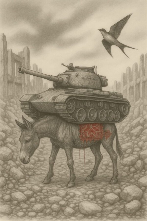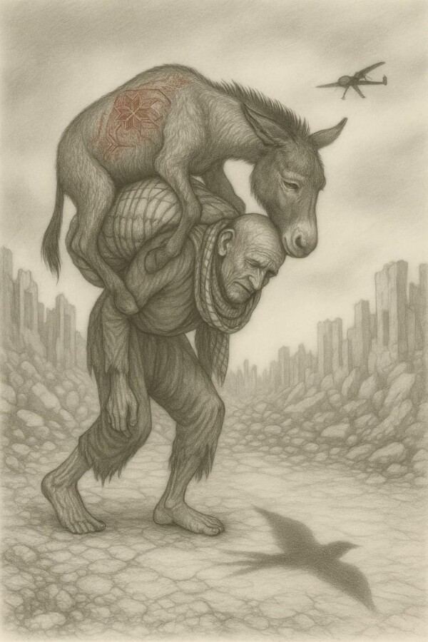 تضعنا المجموعة أمام صدمة الصورة التشكيلية، الحمار الذي حمل المؤن والجرحى في الماضي، يُترك اليوم مثقلاً بالركام. هذه الصورة تستدعي فلسفة إيمانويل ليفيناس حول “وجه الآخر” بوصفه نداءً أخلاقيًا لا يمكن تجاهله.