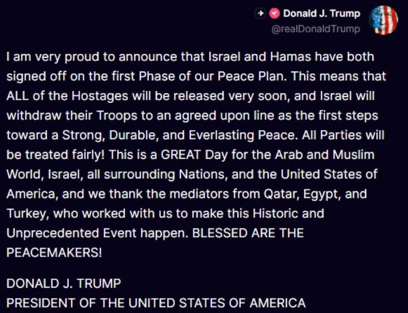وأعلن الرئيس الأميركي دونالد ترامب توقيع إسرائيل وحركة حماس على المرحلة الأولى من خطته للسلام. وأكد أن “هذا يعني أنه سيتم إطلاق سراح جميع الرهائن قريبا جدا. كما أن إسرائيل ستسحب قواتها إلى خط متفق عليه كخطوات أولى نحو سلام قوي ودائم.