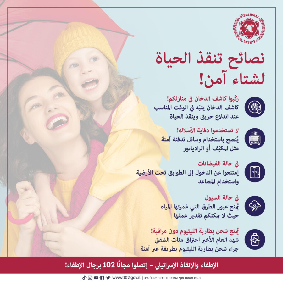 وفي السياق، قال بيان صادر عن مكتب كايد ظاهر – الناطق الرسمي للإعلام العربي لسلطة الاطفاء والإنقاذ، إنه “وفقًا لتوقعات دائرة الأرصاد الجوية، من المتوقع أن تشهد البلاد طقس شتوي خلال نهاية الأسبوع، حيث من المنتظر أن تبدأ أمطار محلية بالهطول ليلة الخميس – الجمعة في منطقة الجنوب. وخلال ساعات الليل ستمتد الأمطار إلى منطقتي الشمال والوسط، خاصة في منطقة الساحل