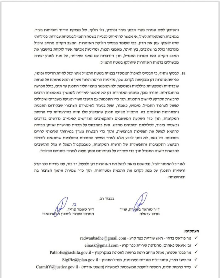 وبعد فحص الجوانب القانونية لهذه الإجراءات، أكّد المركزان أن الإشعارات التي وُزّعت ضمن مخطط تمال 1116 غربي كفر قرع تفتقر إلى الأسس القانونية والتخطيطية اللازمة، وطالبا بوقفها وإبطالها فورًا.