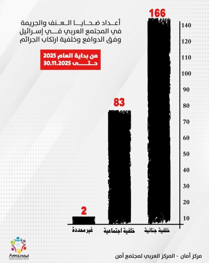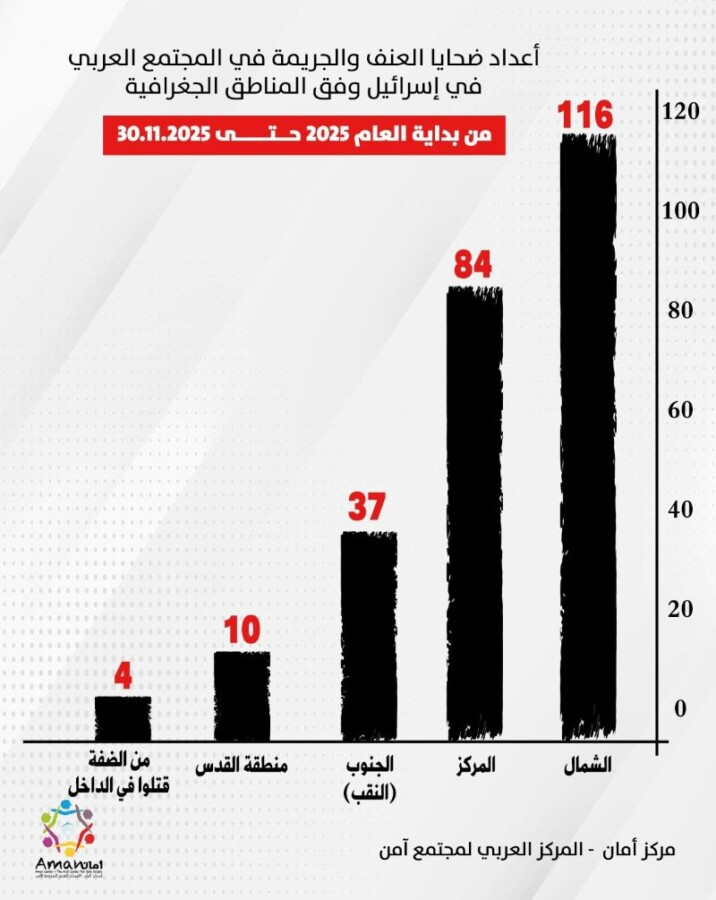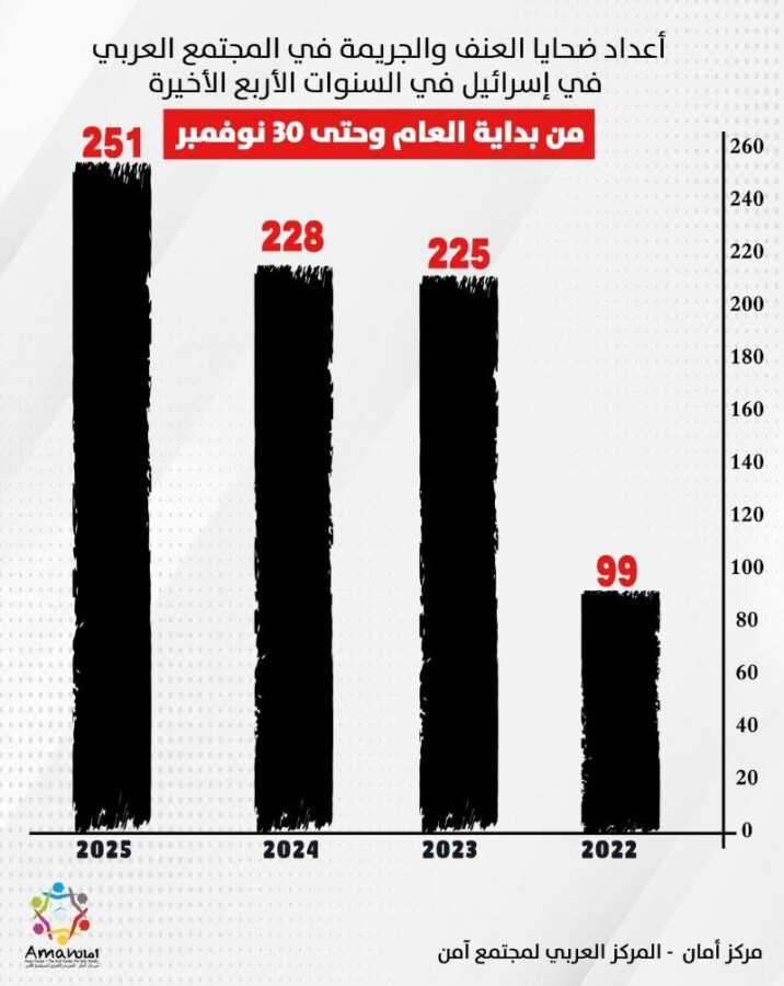 مركز أمان حول جرائم العنف: 251 ضحية حتى نهاية نوفمبر.. أعلى من الرقم القياسي السنوي لعام 2023 (247 ضحية)