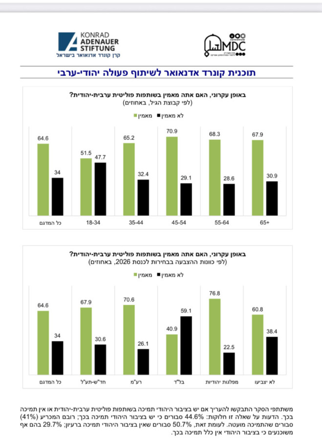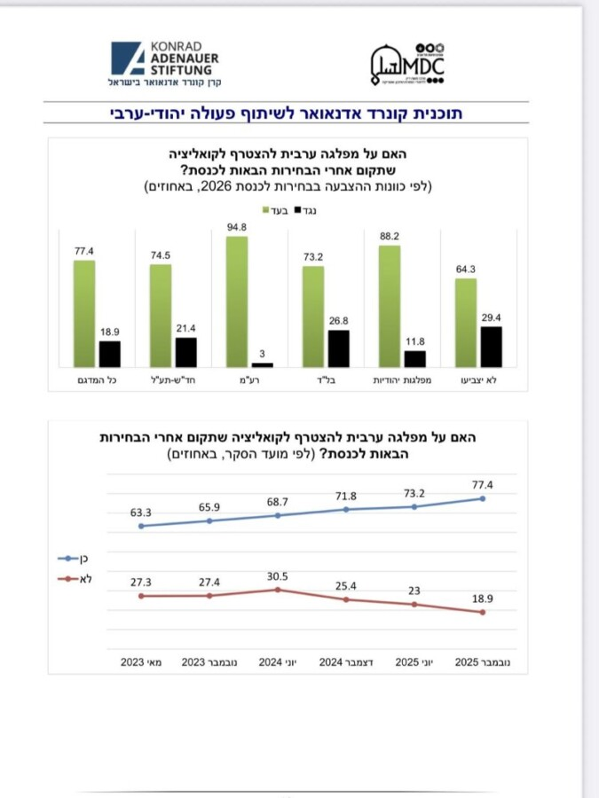 * أغلبية كبيرة (77.4%) من الناخبين العرب تؤيد انضمام حزب عربي إلى الحكومة التي ستُشكل بعد الانتخابات القادمة: 45.6% يؤيدون الانضمام إلى أي حكومة تُشكل، و31.8% يؤيدون الانضمام إلى حكومة يسار وسط. وهذه النسب مماثلة لنتائج استطلاعات سابقة أجراها برنامج كونراد أديناور خلال الحرب.