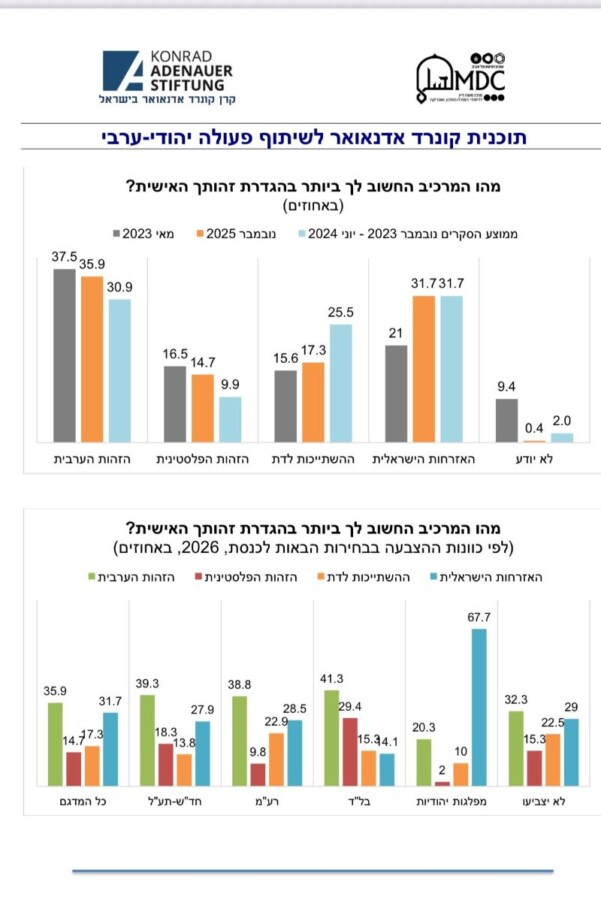 وتعقيبًا على هذه النتائج، يقول الدكتور أريك رودنيتسكي، مدير برنامج كونراد أديناور للتعاون اليهودي العربي في مركز موشيه ديان بجامعة تل ابيب: “لم يكن العامان الماضيان سهلين على المواطنين العرب، إذ أثّرت الحرب المستمرة في غزة ومعاناة الشعب الفلسطيني عليهم بشكل كبير. ومع ذلك، فإن دعم انضمام حزب عربي إلى الائتلاف، والإيمان بشراكة سياسية عربية يهودية – في ظل الحرب المطولة – كل هذا يُظهر أن الجمهور العربي يُظهر نضجًا سياسيًا ملحوظًا، محافظًا على قيم النظام العام والديمقراطية، ويسعى الآن إلى المساهمة بدورِه في إعادة بناء المجتمع الإسرائيلي ككل بعد الحرب”.