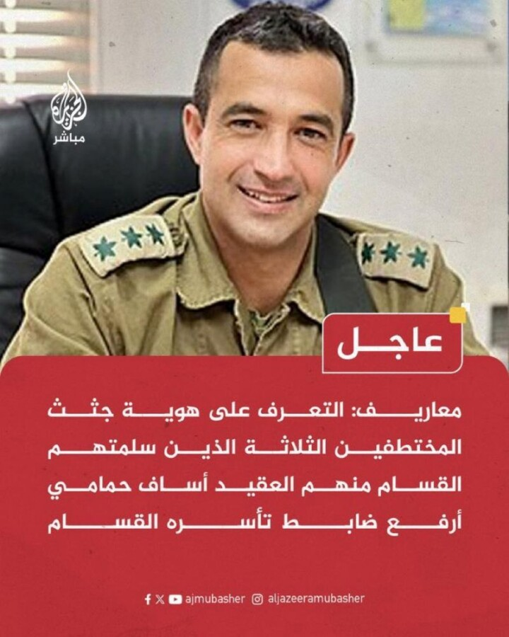 إسرائيل تتسلم 3 جثث لمختطفين عسكريين في غزة بينها جثة العقيد أساف حمامي- أرفع قائد عسكري تأسره الفصائل