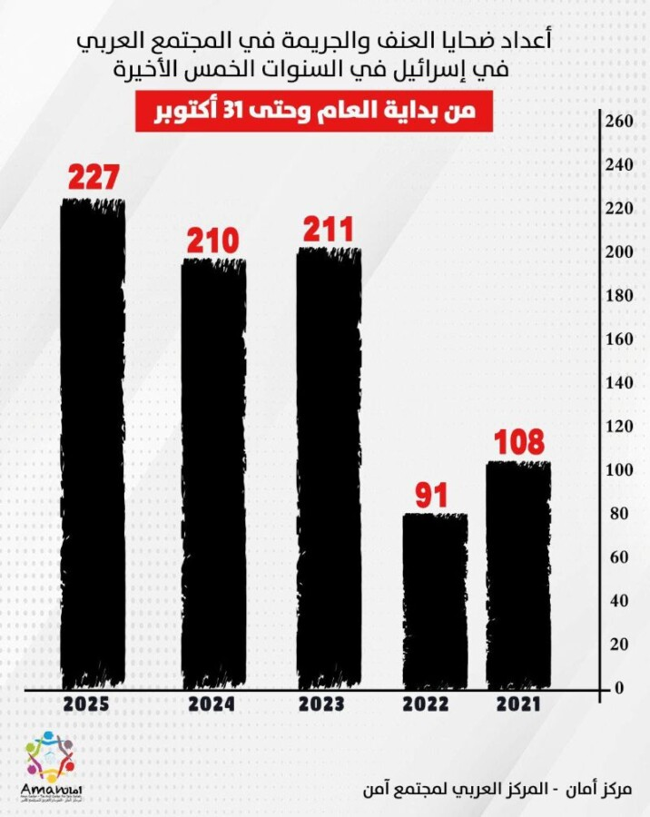 مركز أمان: تصاعد مستمر في معدلات الجريمة للعام الثالث ورصد 227 ضحية حتى نهاية أكتوبر 2025.. الأعلى تاريخيًا في المجتمع العربي!