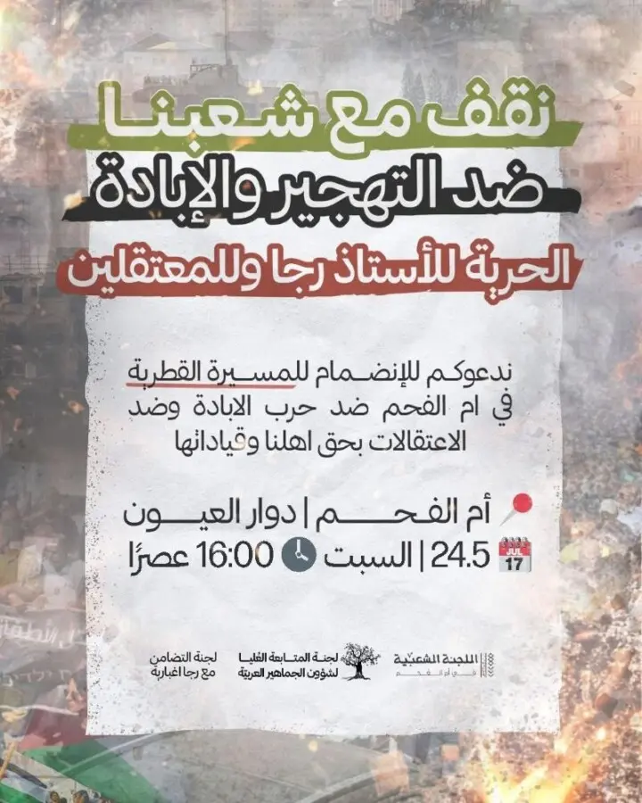تحت شعارات: “نقف مع شعبنا ضد التهجير والإبادة” و”الحرية للأستاذ رجا إغبارية والمعتقلين”، تنظم لجنة المتابعة العليا للجماهير العربية في…